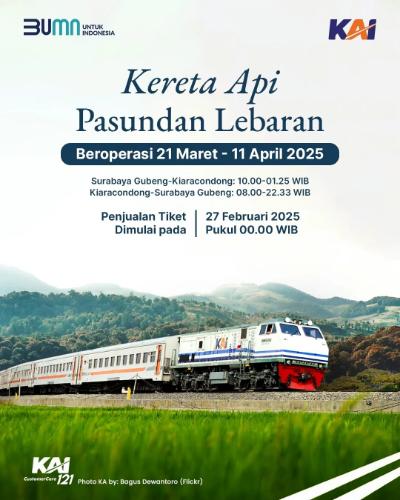 Untuk informasi lebih lanjut terkait jadwal, tarif, dan pemesanan tiket KA tambahan, pelanggan dapat menghubungi layanan pelanggan KAI 121 melalui Contact Center (CC) 121 di nomor telepon 121/(021) 121, nomor WhatsApp 0811-1211-1121, email cs@kai.id, atau media sosial resmi KAI. (Sip).