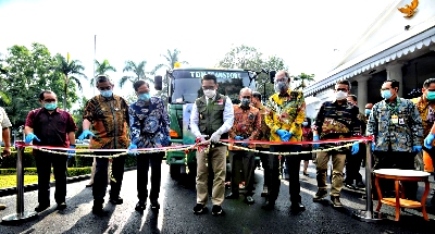 Gubernur Jabar Ridwan Kamil secara langsung melepas seremoni Wkspor 16.650 Kg atau kurang lebih 16 Ton Kopi Arabika Java Preanger Jabarano ke Sydney, Australia, di Gedung Pakuan, Bandung, Jumat (9/10/2020).