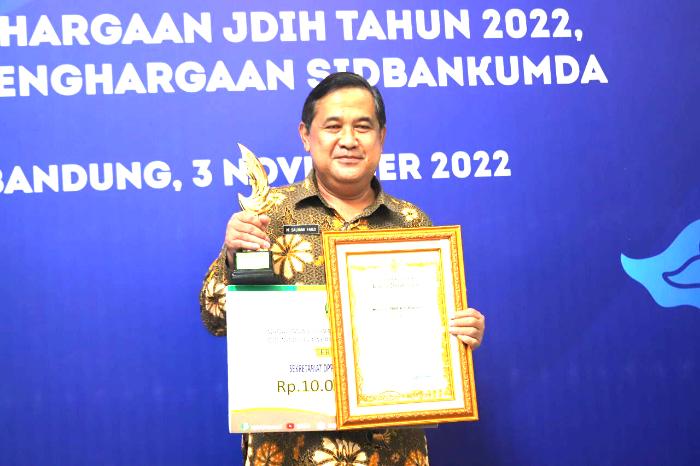 KET: Mendiang H. Mohamad Salman Fauzi, saat menerima penghargaan JDIH bagi DPRD Kota Bandung, di Gedung Sate, November 2022. Nuzon/Humpro DPRD Kota Bandung.
