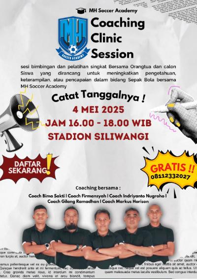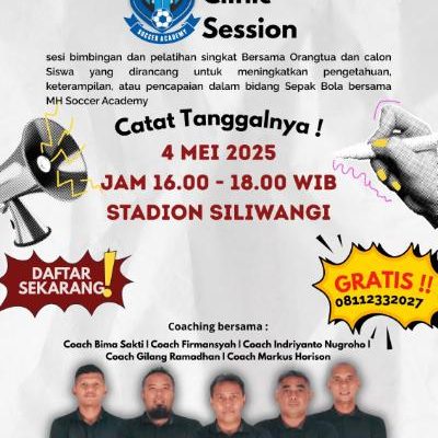 BANDUNG, BEREDUKASI.COM — MH Soccer Academy akan menggelar kegiatan Coaching Clinic Session yang dirancang khusus sebagai sesi pelatihan dan pembinaan singkat bagi anak-anak dan orang tua yang berminat mendalami dunia sepak bola sejak usia dini. Acara ini akan berlangsung pada Minggu, 4 Mei 2025, pukul 16.00–18.00 WIB, bertempat di Stadion Siliwangi, Kota Bandung.