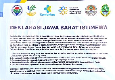 BANDUNG, BEREDUKASI.COM — MENTERI Kependudukan dan Pembangunan Keluarga/Kepala Badan Kependudukan dan Keluarga Berencana Nasional (BKKBN), Wihaji, bersama Menteri Kesehatan Budi Gunadi Sadikin, Menteri Sosial, Saifullah Yusuf dan Menteri Desa, Pembangunan Daerah Tertinggal dan Transmigrasi Yandri Susanto. Turut menandatangani “Deklarasi Jawa Barat Istimewa”. Sebuah Deklarasi yang menyatakan kesiapan Jawa Barat bersinergi dan bergotong royong, demi mewujudkan Desa dan Kelurahan yang tidak ada Kematian Ibu, Bayi, Ibu Melahirkan serta tidak ada Stunting baru.