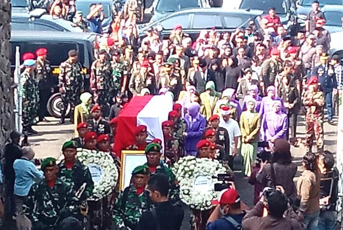 Prosesi pemakaman berlangsung dengan suasana yang khidmat. Bahkan selain dihadiri keluarga, kerabat, serta jajaran TNI yang memberikan penghormatan terakhir.