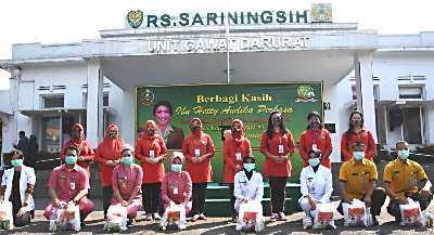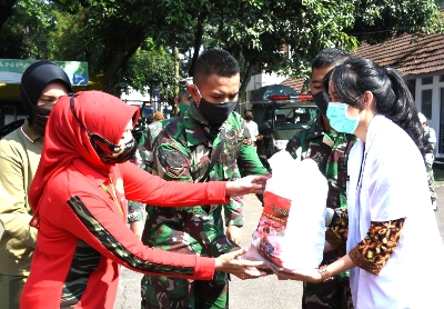 Usai memberikan sambutan dilakukan penyerahan bantuan Paket Sembako Secara simbolis. Kepada Tenaga Medis RS Tingkat II Dustira dan kepada Tenaga Medis RS Tingkat IV Sariningsih.