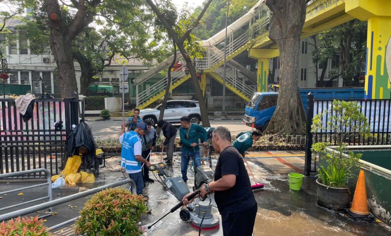 Di sekitar Masjid Agung Bandung, suasana pagi terlihat lebih tertata. Petugas dengan perlengkapan sederhana seperti sapu, pengki, dan karung sampah berjajar di sepanjang jalur pedestrian. Mereka bekerja secara bergotong royong, memastikan tidak ada sampah yang tersisa di area yang kerap dipadati jemaah tersebut.